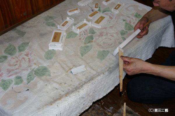 理由としまして半田地に使用する砥粉の粒子が文字を彫刻する際、彫刻刀をすぐに切れ止ますため、文字を彫刻する札部分には砥粉より粒子の細かい胡粉(貝殻の粉)を使った胡粉地のみを使用します。そうする事により彫刻刀の切れ味が長持ちするためそれを使用します。ですので札部分は少し厚めにヘラ付けします。