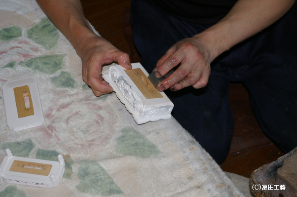 6. 胡粉地砥ぎが終わるともう一度、今度は台座の平面や角に半田地を付けていきます。