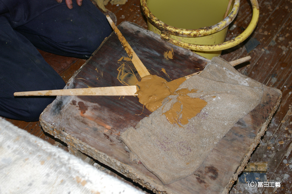 写真は砥粉と膠を混ぜ合わしているところ。胡粉地は白色に対し半田地は茶色の色をしてます。