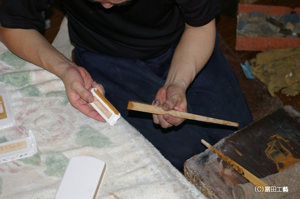 2. 胡粉地を桧ヘラを用いて漆を塗る部分に付けていきます。