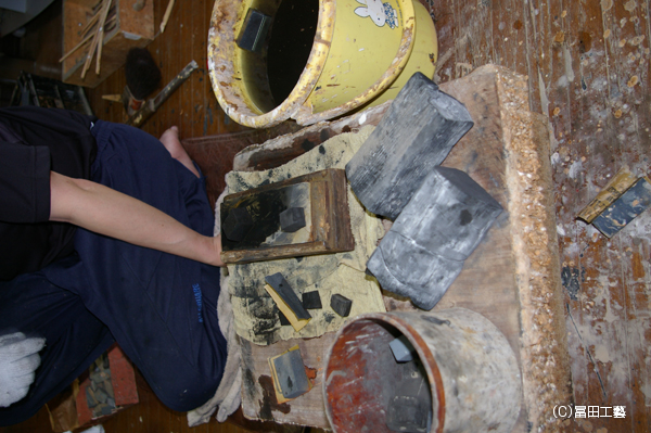 その研ぎには上部の写真にもある駿河炭という炭の木目の部分で研いでいきます。炭は弾力がなく適度に水分を吸収するため、鋭く平滑に表面を研ぐことが出来ます。耐水ペーパーなどを代用されることもあるのですが炭に勝るものはなく、こだわって駿河炭を使用しております。