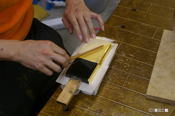 金箔を漆が乾かないうちに手際よく乗せていきます。