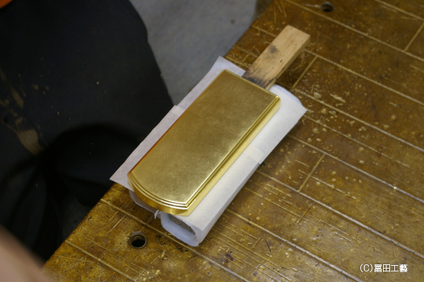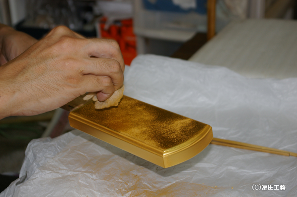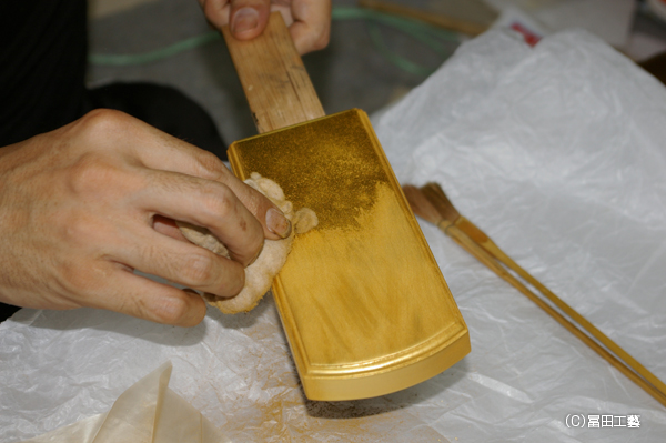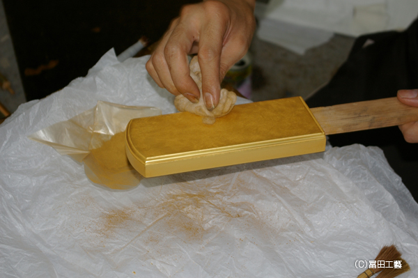 ぬぐい粉は金箔を押して乾かした後、その金箔の上にもう一度、箔押し漆を塗り金粉を蒔く工程の事を言います。