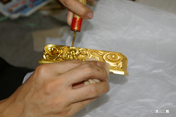 6. 金箔押し工程で完成の御位牌(面金・総金仕上げ)も御座いますが、”総粉仕上げ”と明記 されております御位牌は更に”ぬぐい粉工程”という作業に入っていきます。