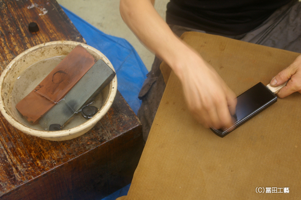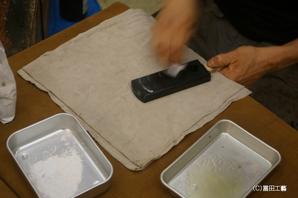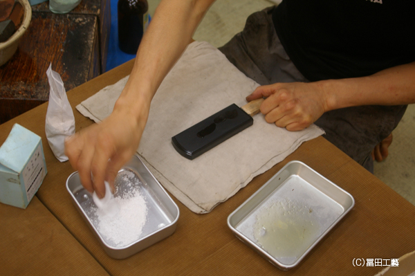 6. 蝋色炭の研ぎ痕を今度は専用研磨剤で摺っていき、更に表面の肌理を細かくします。