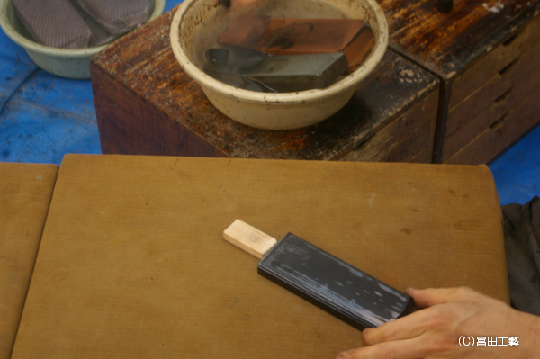 ある駿河炭という炭の木目の部分で研いでいきます。