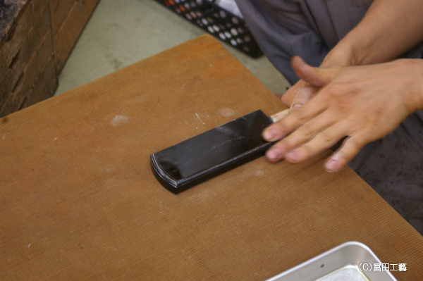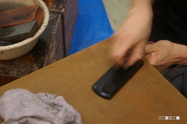 9. 生漆をが乾くと今度はその表面を油と研磨剤を使って、